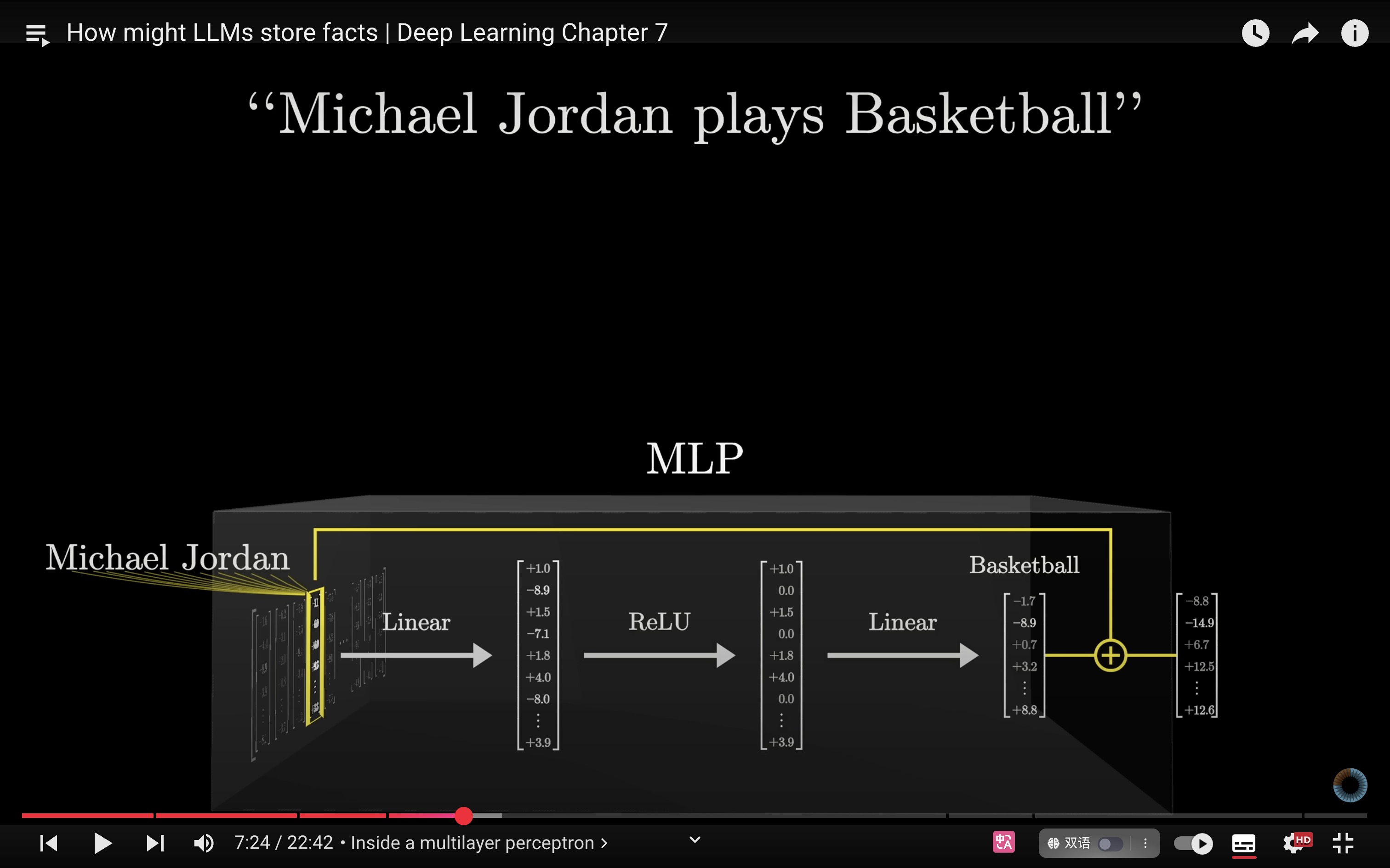 - 基于上下文的运算:在 MLP 中,每个 token 都是独立运算的,但输入的向量已经是被注意力头“注入了上下文”的。